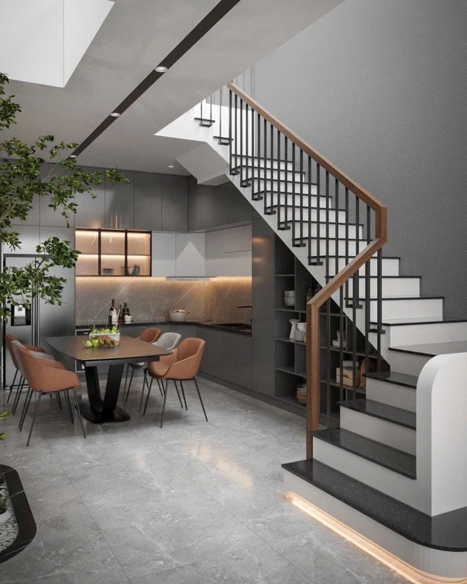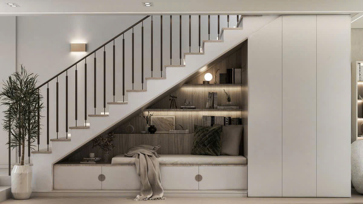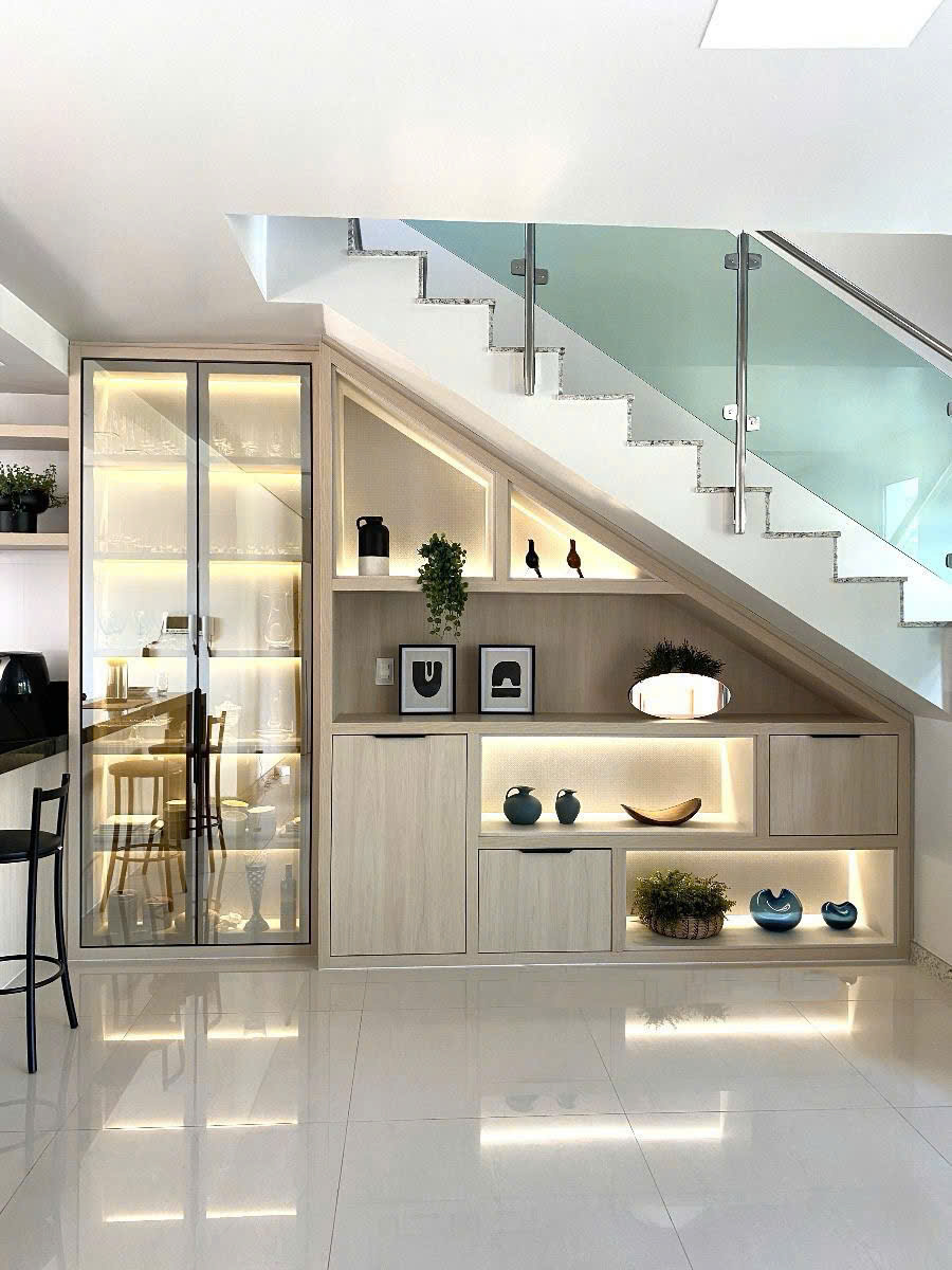 Gầm cầu thang từng ít được chú ý, nhưng trong thiết kế 2025, khu vực này trở thành “kho báu” để tạo nên không gian thông minh, tiện nghi và sang trọng.
