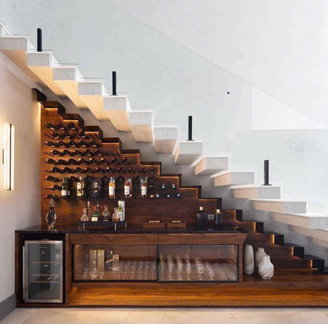 - Tủ rượu dưới gầm cầu thang cực phù hợp căn hộ hiện đại.
