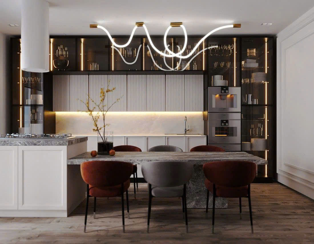 - Phối màu tinh tế giúp phòng bếp dễ chịu và cuốn hút.