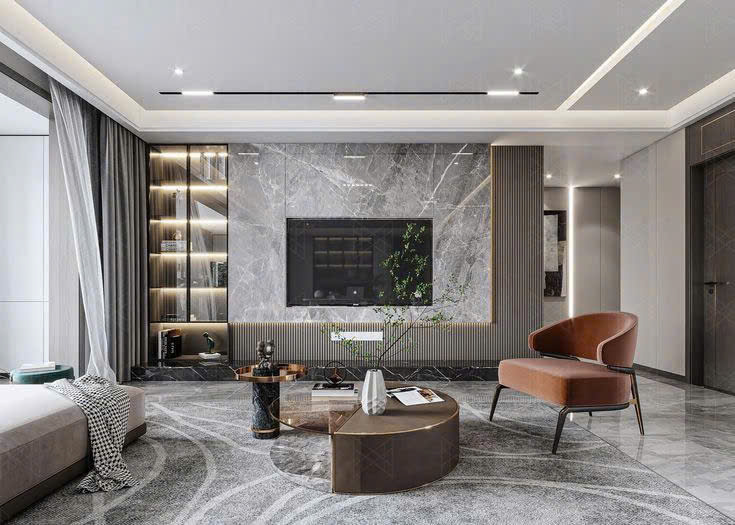 - Bàn trà mặt đá hoặc kính, chân kim loại thanh mảnh.