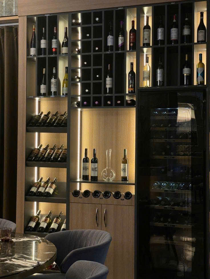 - Đèn LED âm tủ làm nổi bật chai rượu.