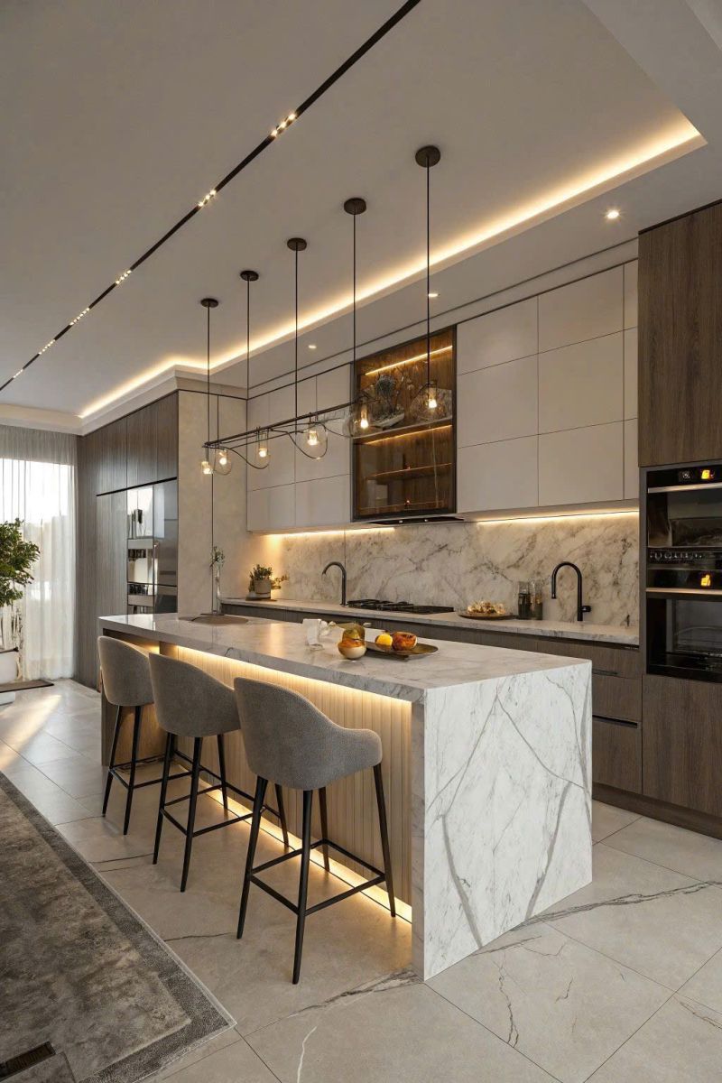 - Đèn thả ở đảo bếp làm điểm nhấn nghệ thuật.