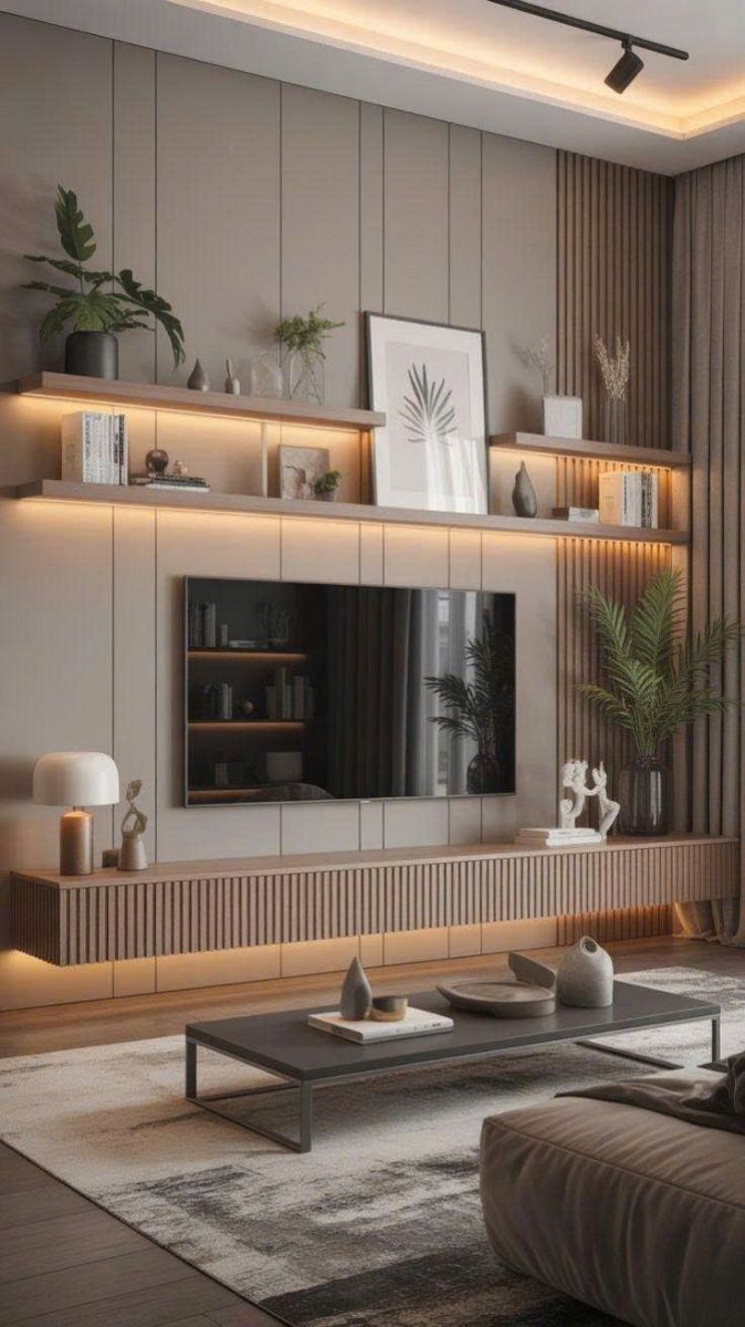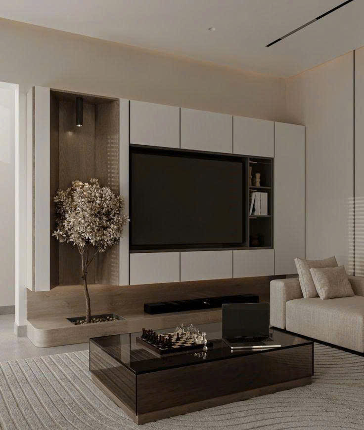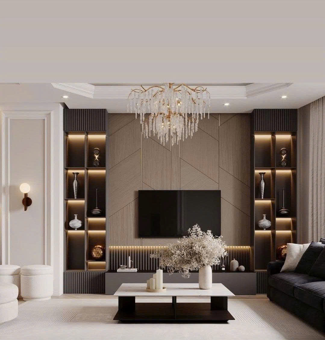 Tủ TV âm tường, hệ tủ liền khối đa năng, thiết kế gọn gàng nhưng đầy tiện ích.