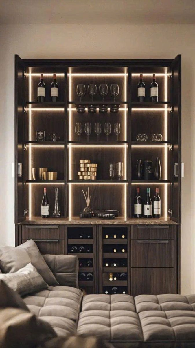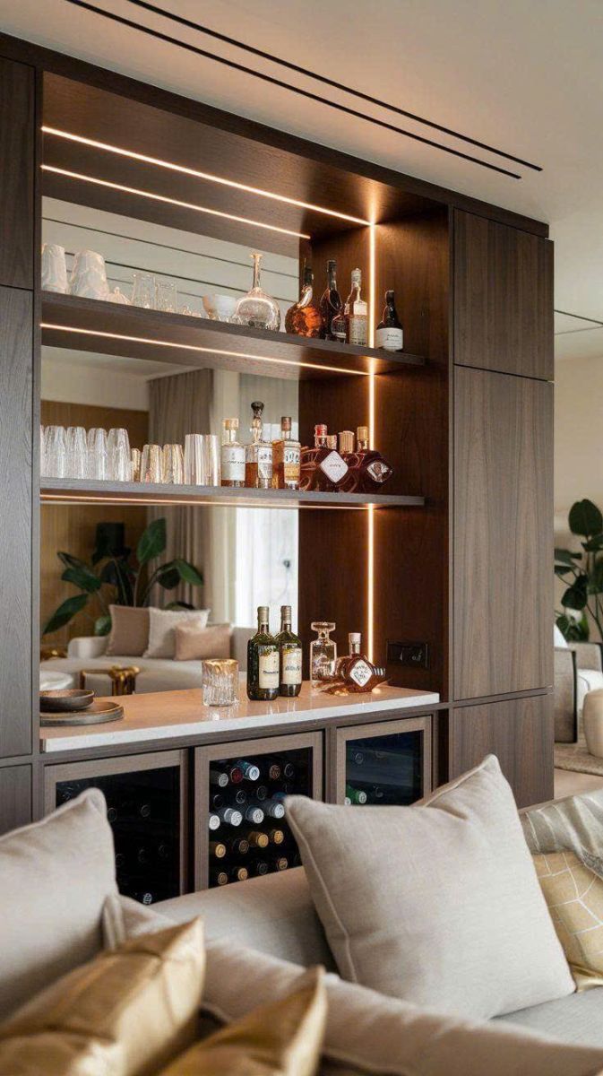 - Quầy rượu kết hợp tủ trang trí: Tăng công năng và thẩm mỹ.