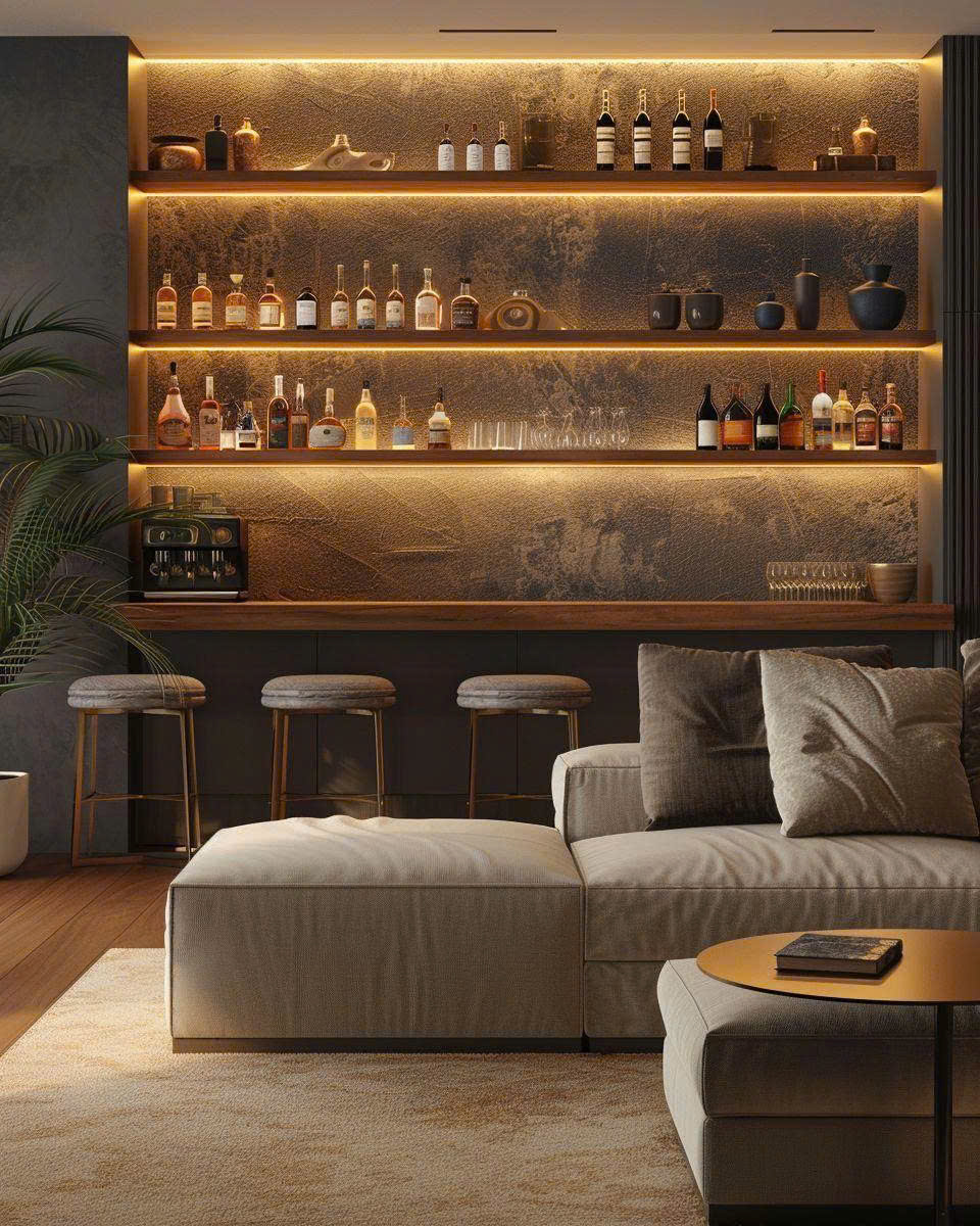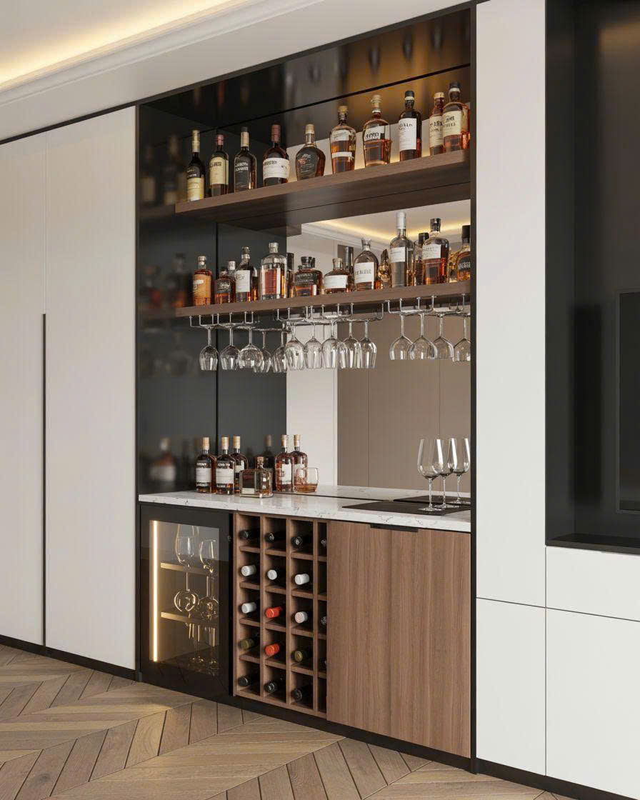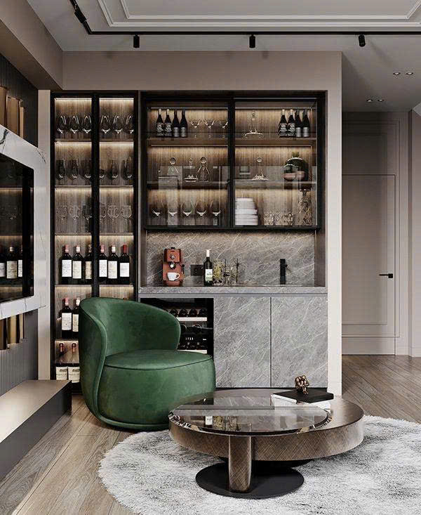 - Quầy rượu mở: Không gian thoáng, phù hợp phong cách tối giản.