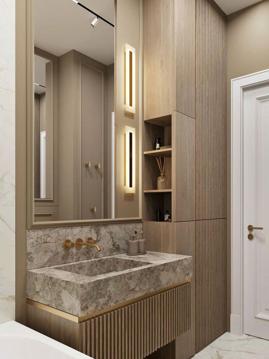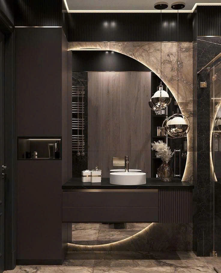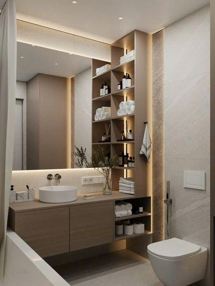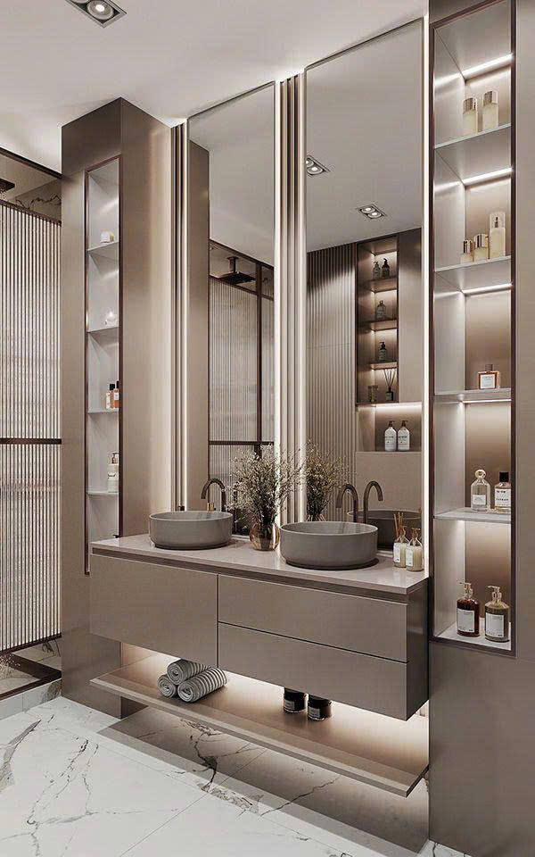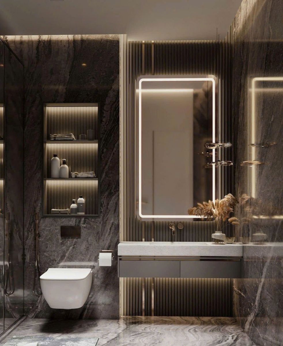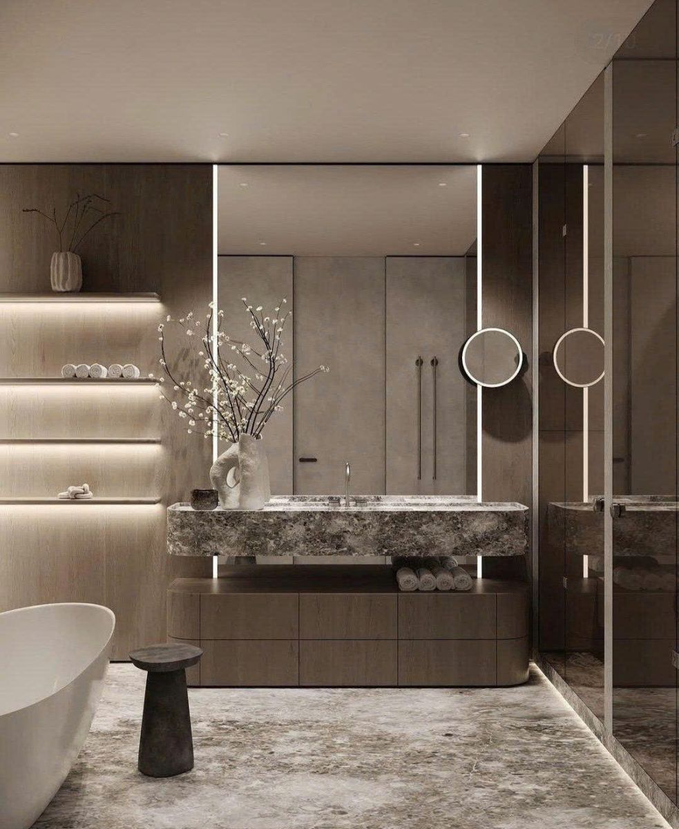 Phòng tắm sang trọng vừa tiện nghi vừa thư giãn. Kết hợp vật liệu cao cấp và ánh sáng tinh tế tạo nên không gian nghệ thuật.
