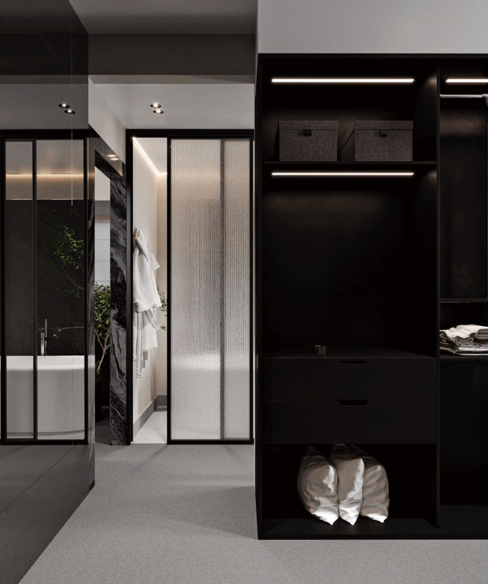 - Tone đen chủ đạo, cánh kính trong/mờ.