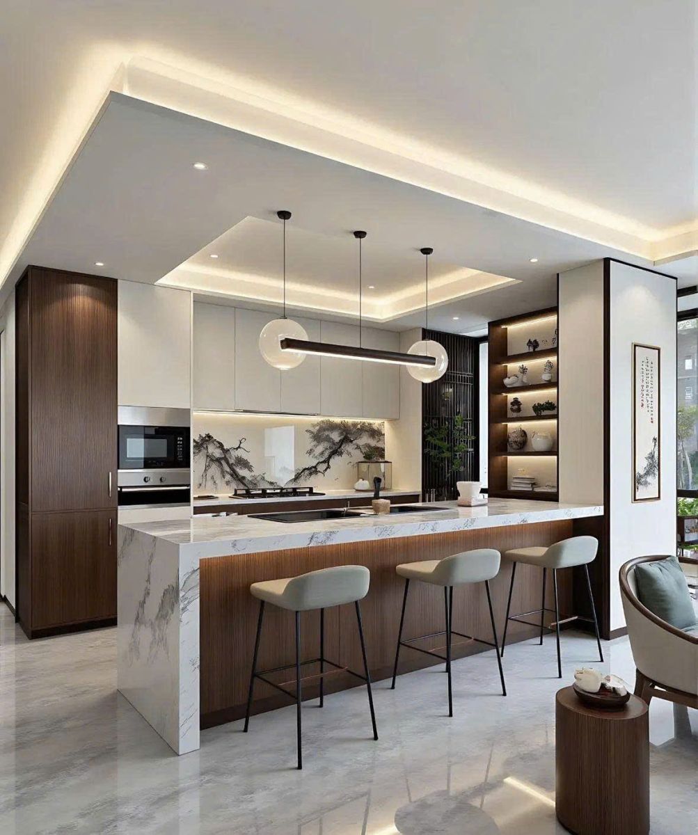 - Đèn thả bàn đảo: vừa trang trí vừa tạo điểm nhấn cho không gian.