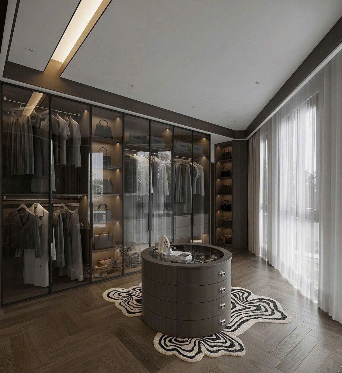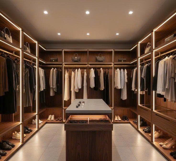- Dạng chữ U: lý tưởng cho phòng thay đồ rộng, tối đa hóa hệ tủ.