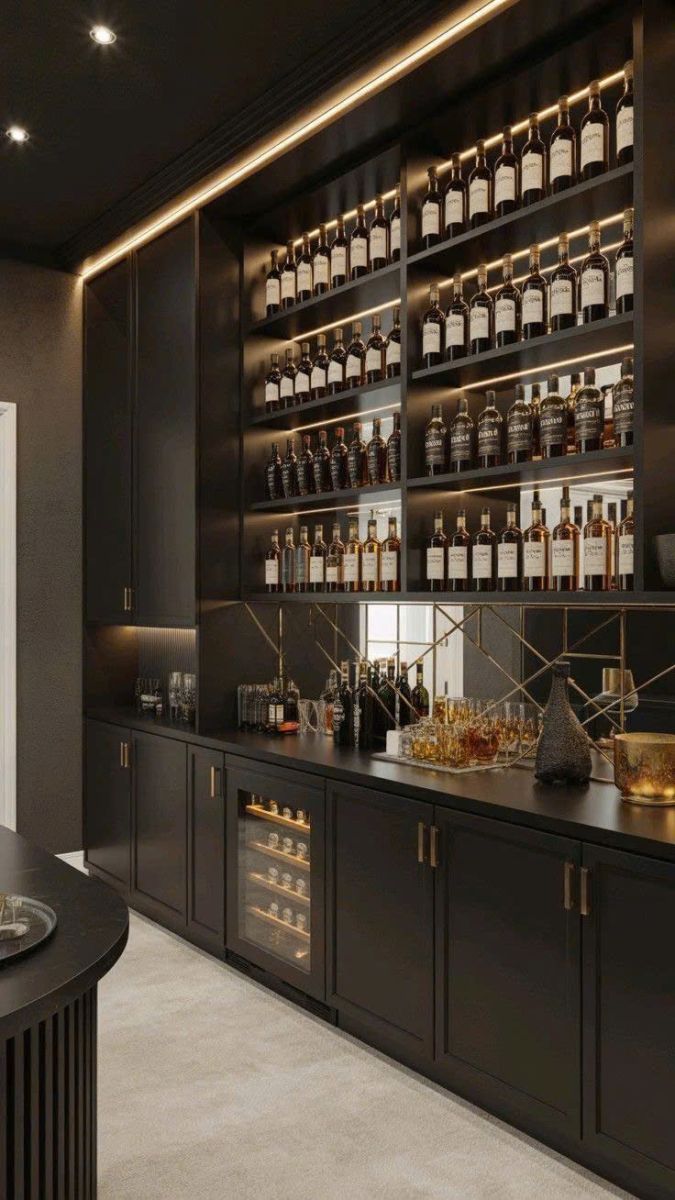 - LED âm tủ làm nổi bật chai rượu trưng bày.