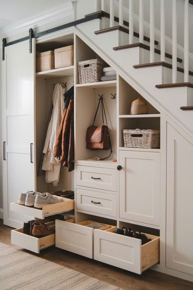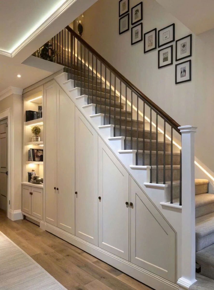 - Tủ âm theo dáng cầu thang giúp giấu đồ gọn gàng, tối ưu diện tích.
