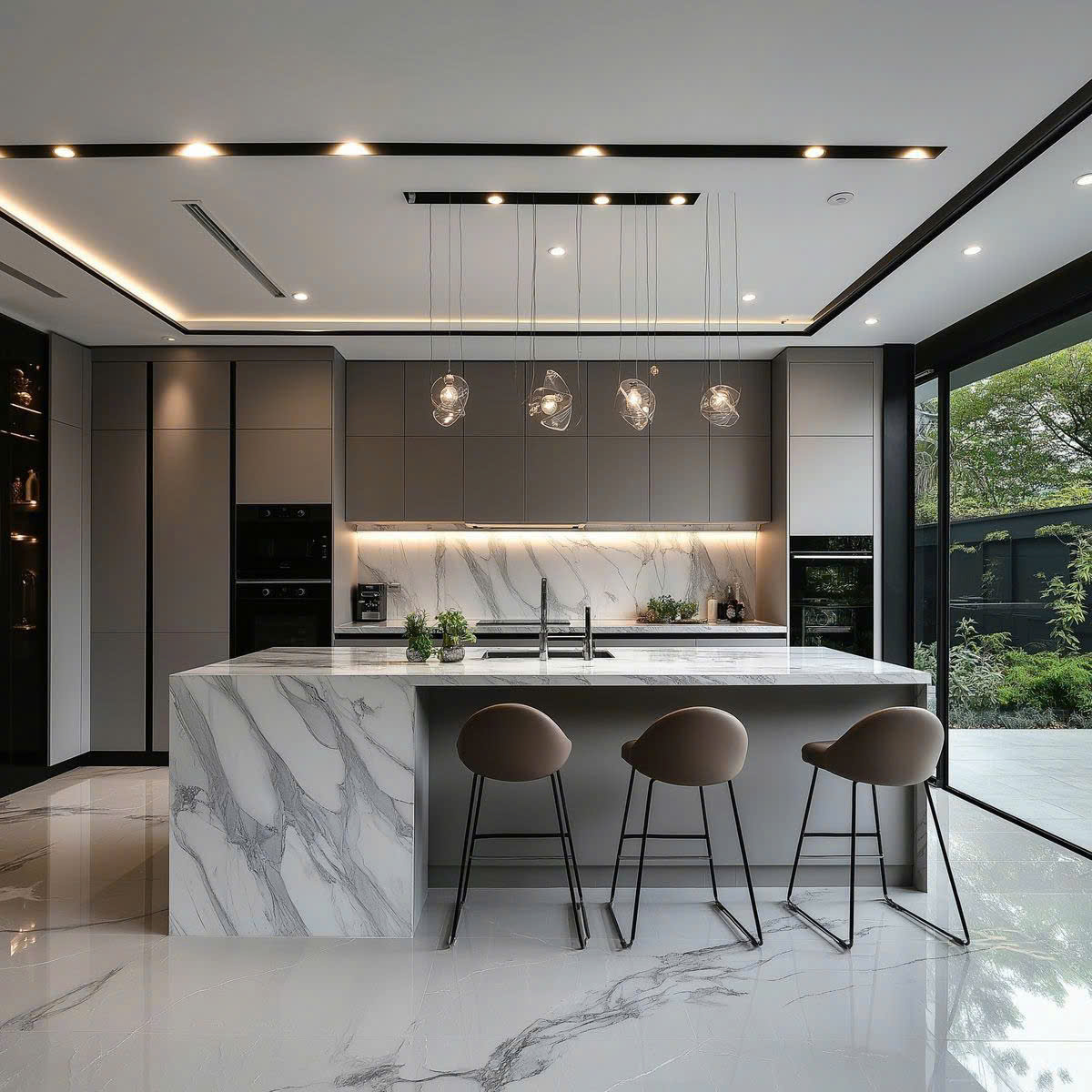 - Đèn thả bàn đảo tạo điểm nhấn thẩm mỹ và chiều sâu không gian
