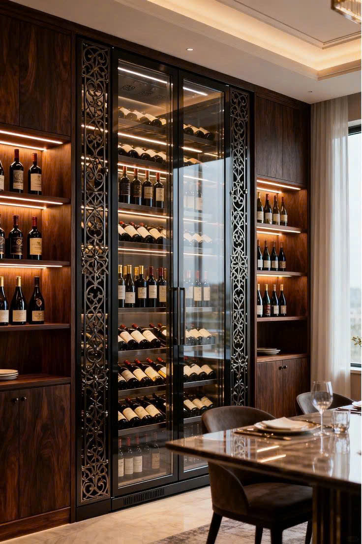 - Cánh Kính nhập khẩu trong suốt hoặc kính khói, tôn vinh bộ sưu tập rượu.