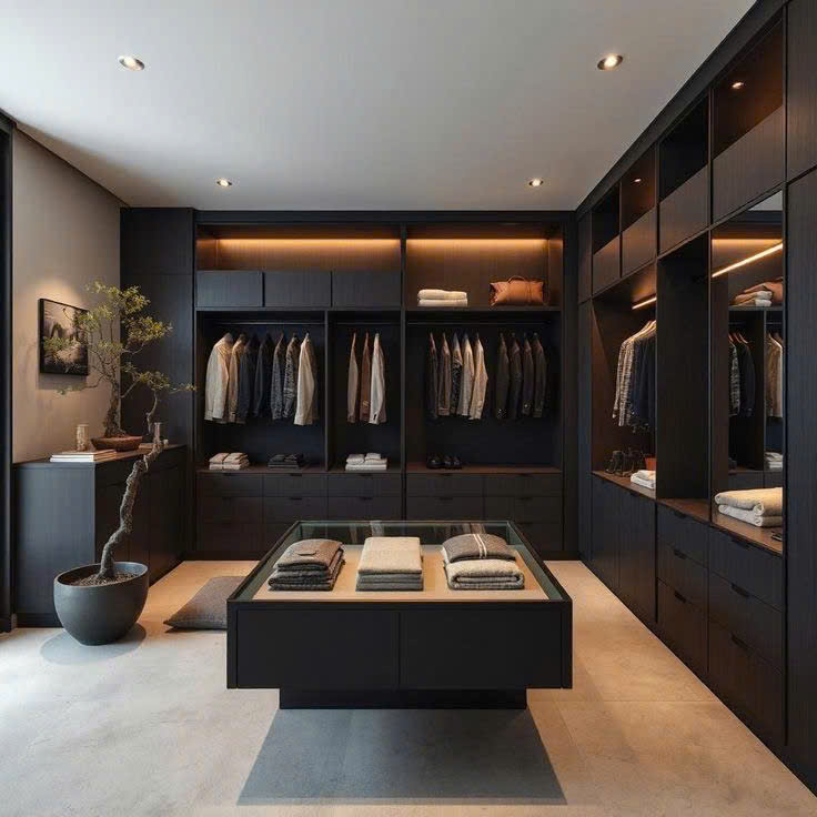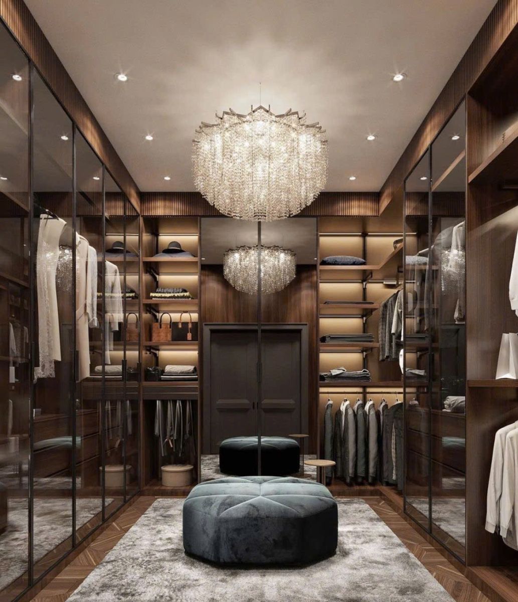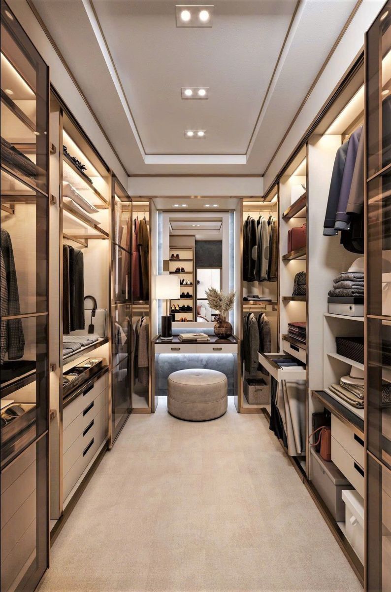 - Có thể thêm bàn trang điểm, ghế băng dài hoặc đảo tủ trung tâm để tăng tiện nghi.