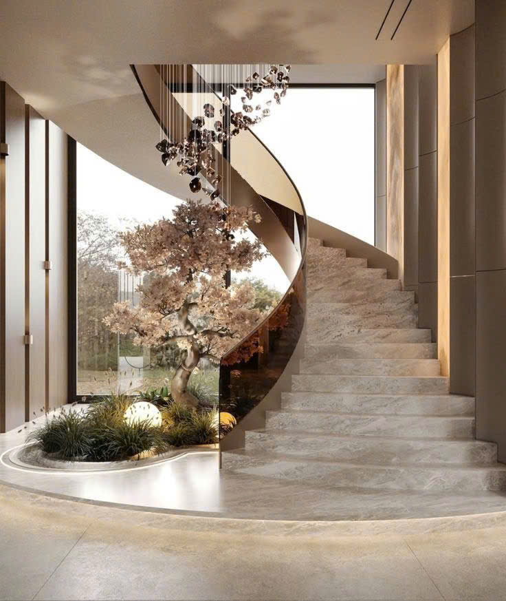 - Cầu thang xoắn / cong nhẹ: mềm mại, mang tính nghệ thuật.