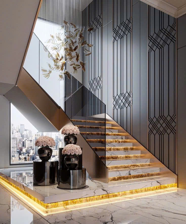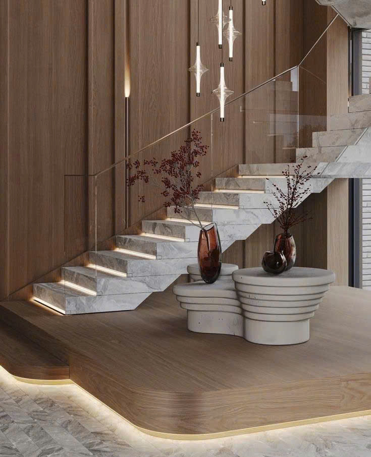 - Ánh sáng gián tiếp giúp cầu thang “nhẹ” và tinh tế hơn.