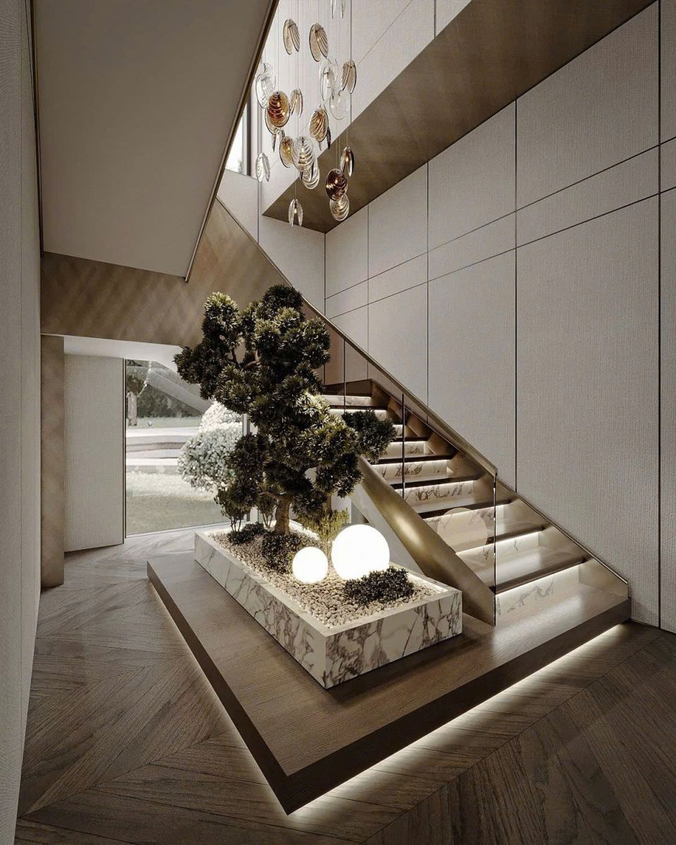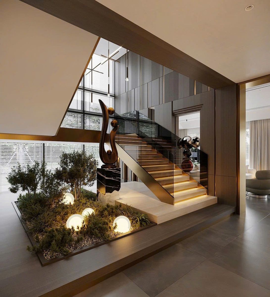 - Cầu thang lệch tầng: tạo chiều sâu và chuyển động không gian.