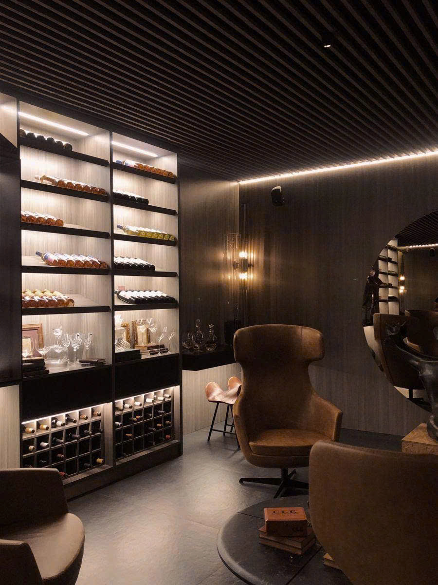 - Hệ LED âm tủ làm nổi bật từng chai rượu, tạo chiều sâu.