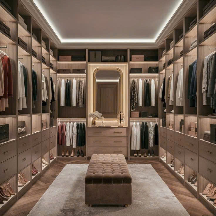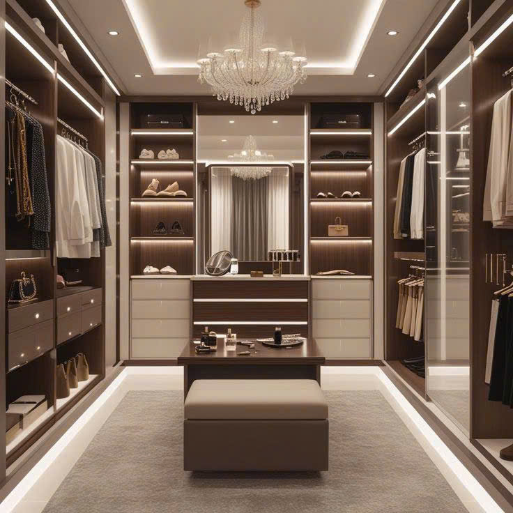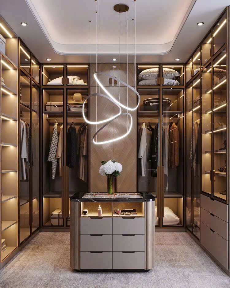 - Đảo giữa: Lưu trữ túi – phụ kiện, tăng điểm nhấn sang trọng.
