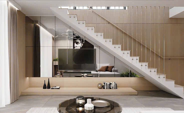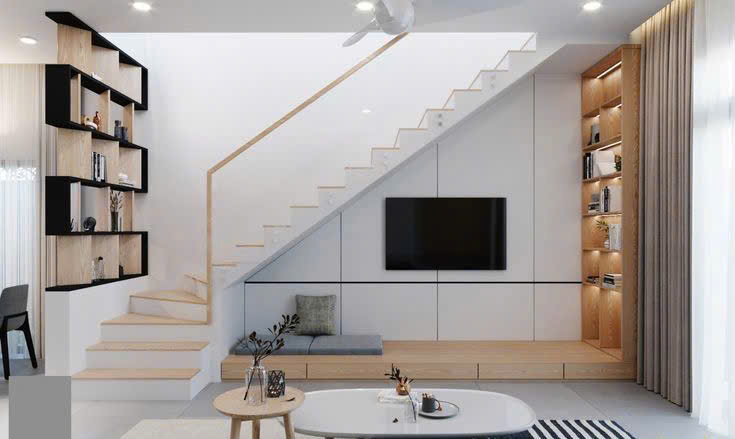 - Kệ tivi liền cầu thang: Tạo bố cục gọn gàng, hiện đại, tiết kiệm diện tích.