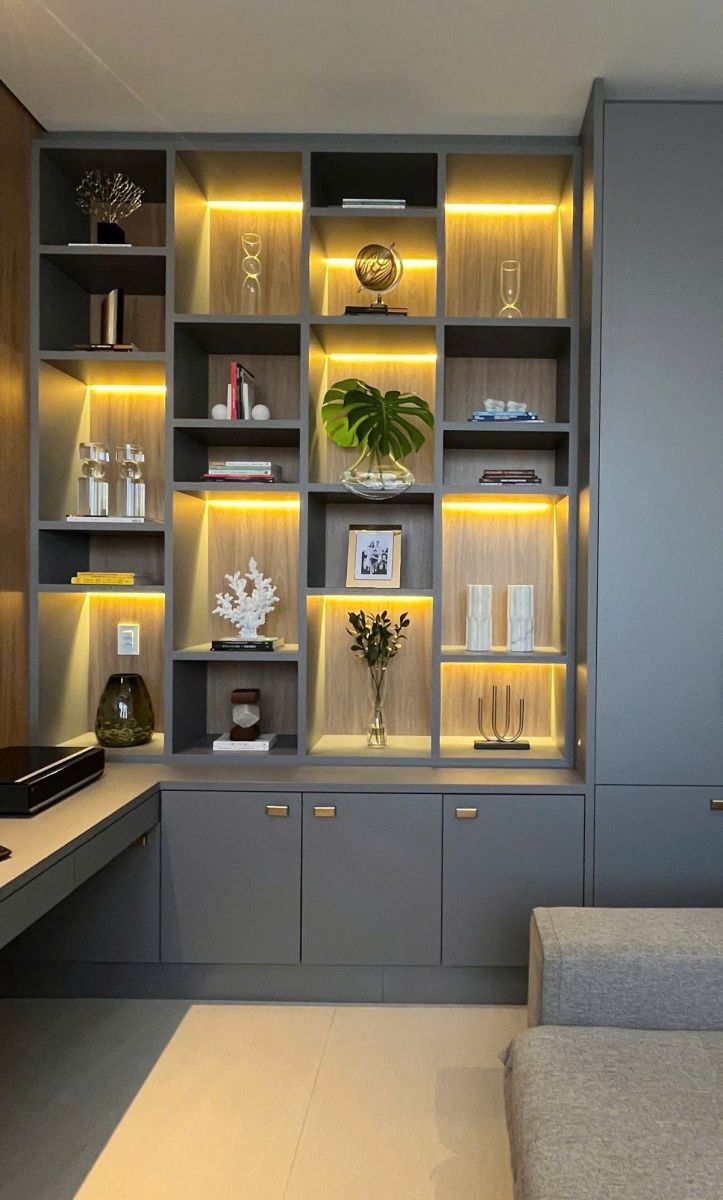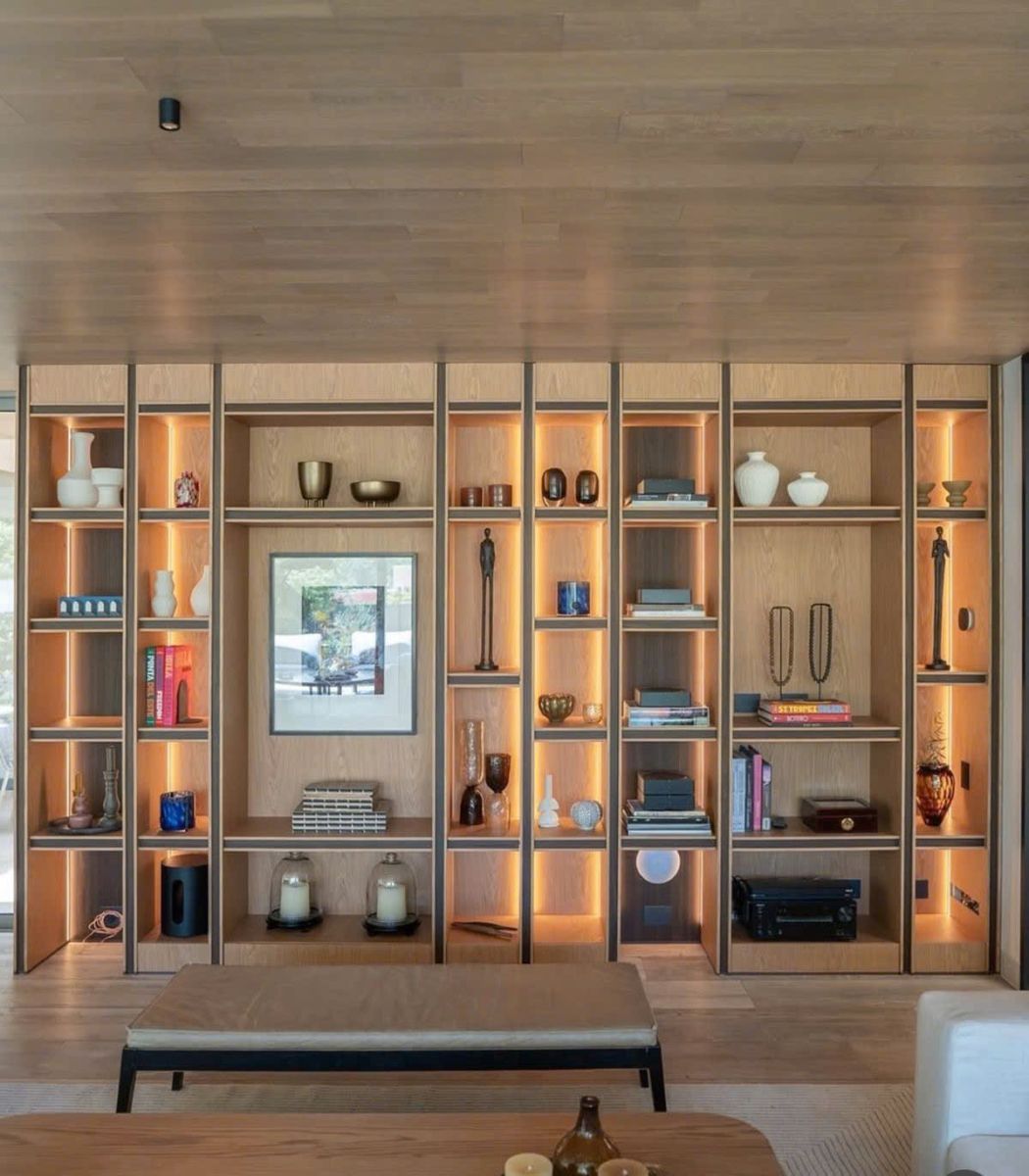 - Đèn LED âm, ánh sáng vàng hoặc trung tính giúp tôn vật phẩm và tạo không gian ấm cúng.