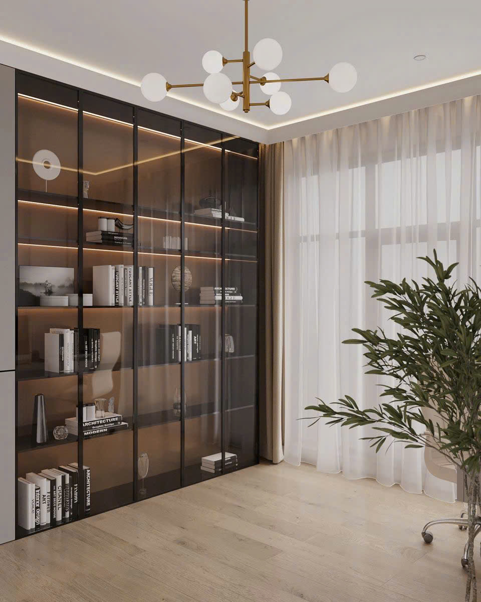 - Phòng khách: Tủ kính cao, tạo điểm nhấn sang trọng.