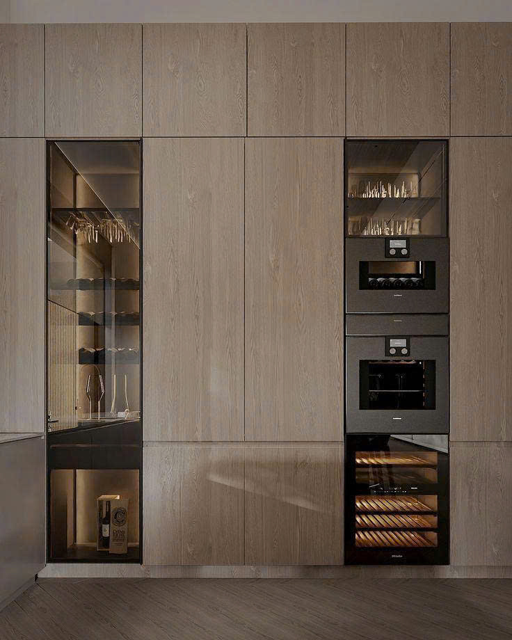 - Tủ rượu âm tường giúp tiết kiệm diện tích, tạo cảm giác liền mạch.