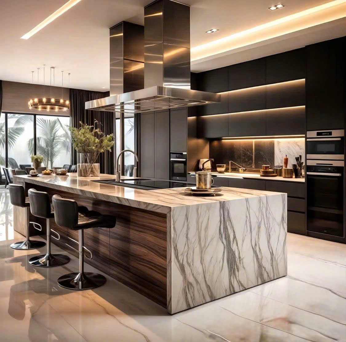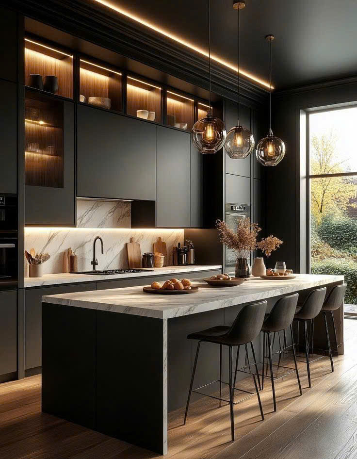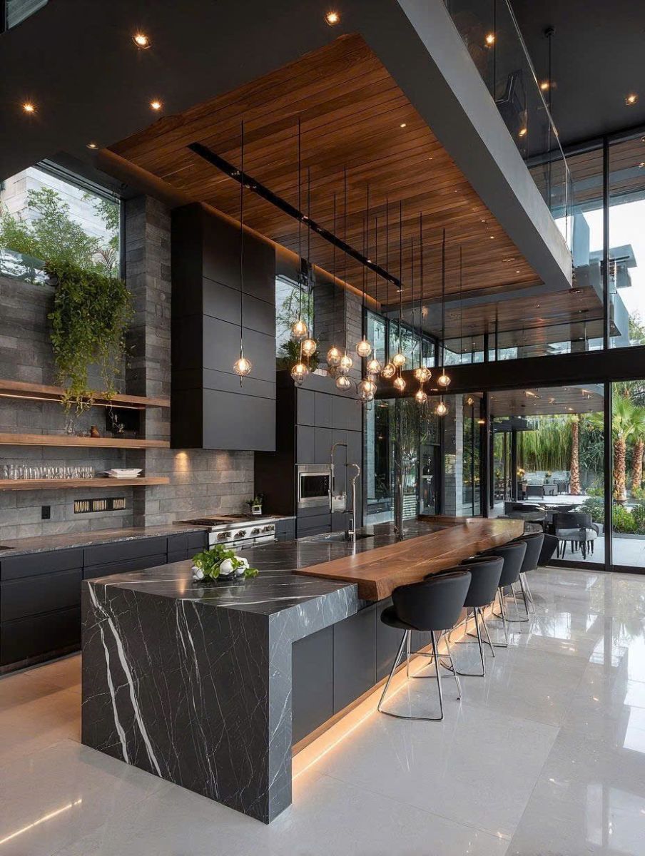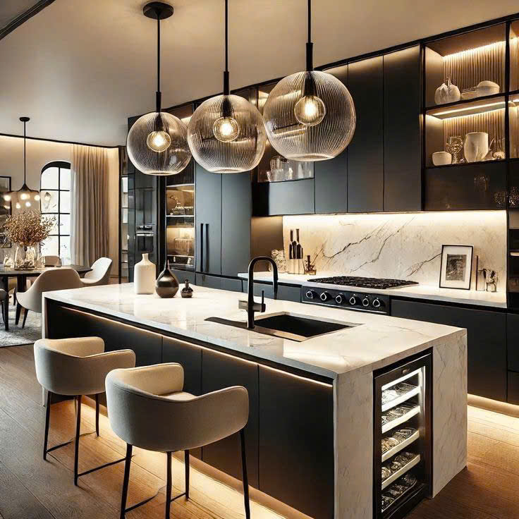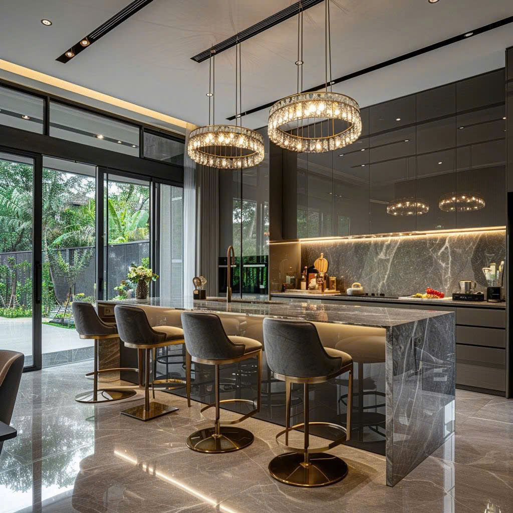 - Đèn thả bàn đảo tạo điểm nhấn và chiều sâu không gian.
