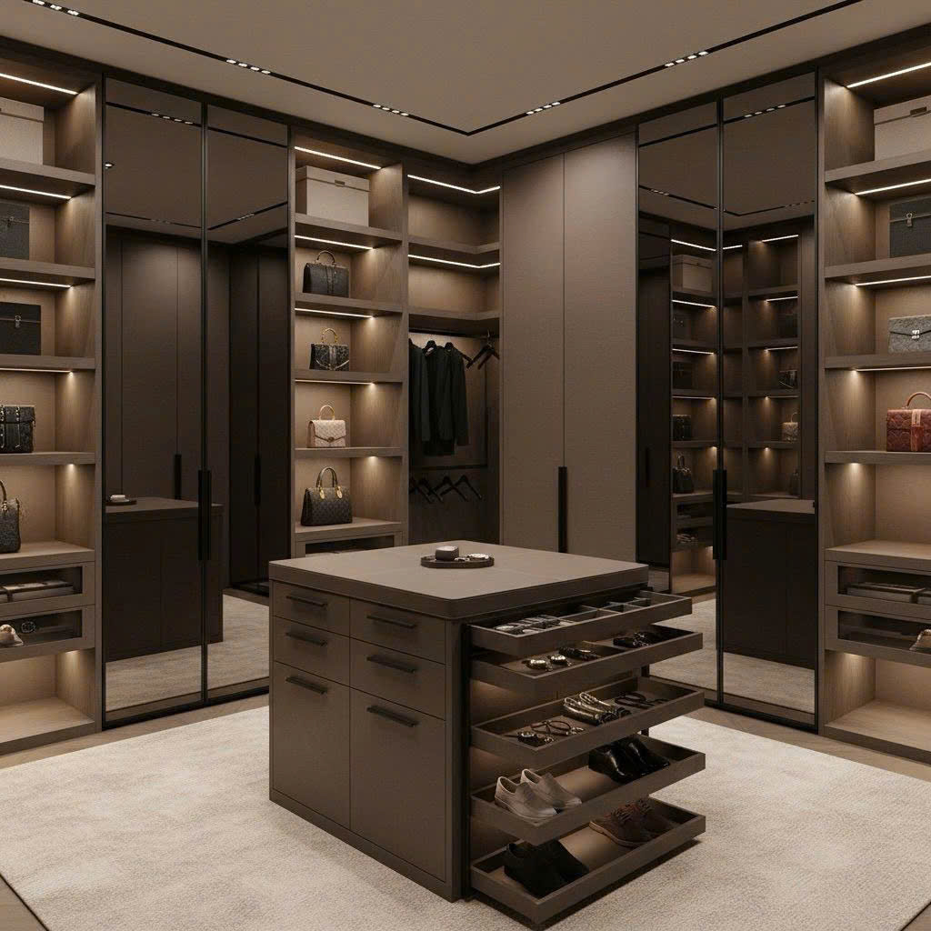 - Bố cục bao quanh: Lưu trữ lớn, tạo cảm giác như boutique tại gia.